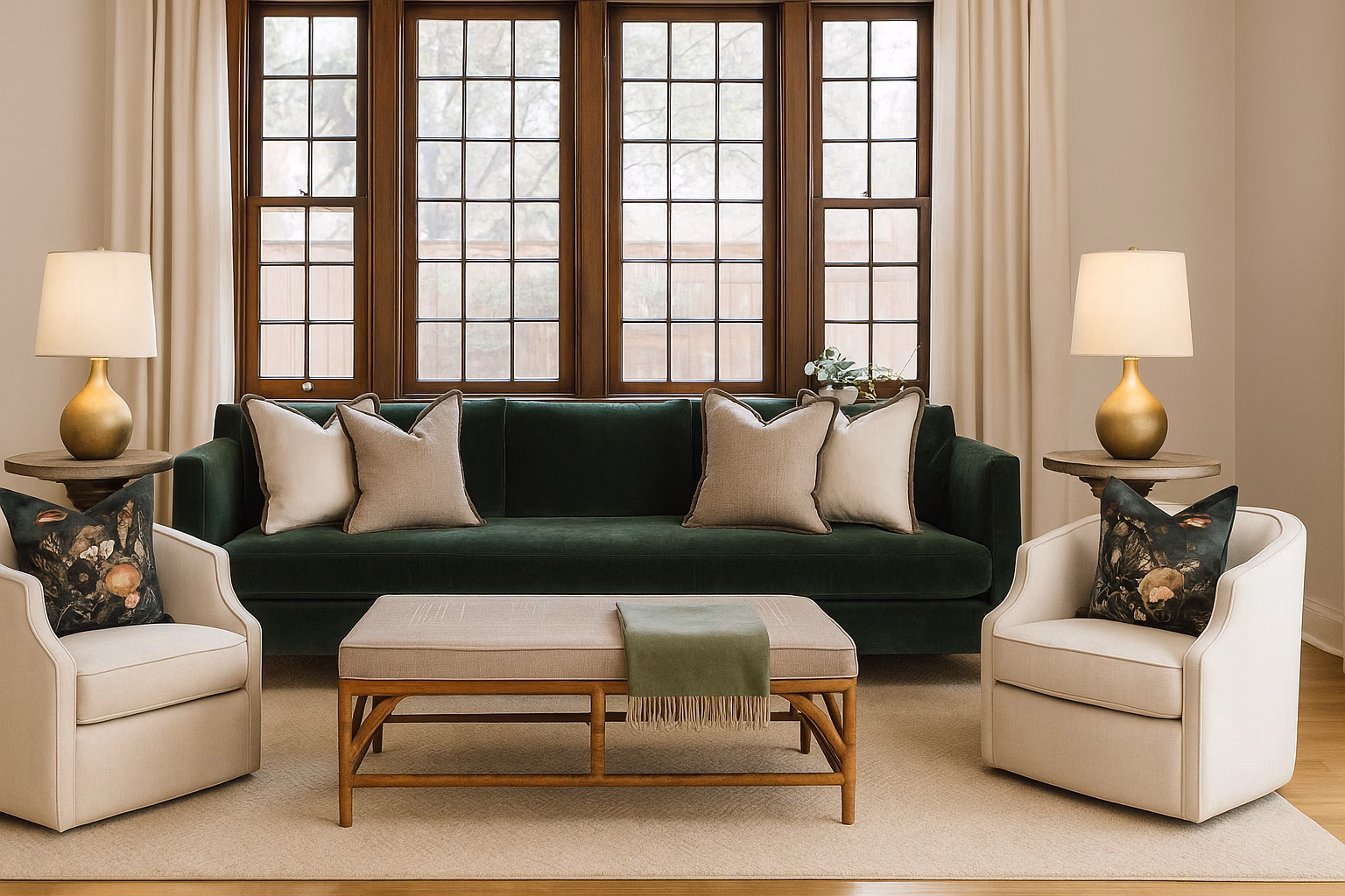 This living space layers rich green with warm accents for a look that’s inviting, grounded, and refined. Symmetry, texture, and color work together to create a room that feels both comfortable and elevated.