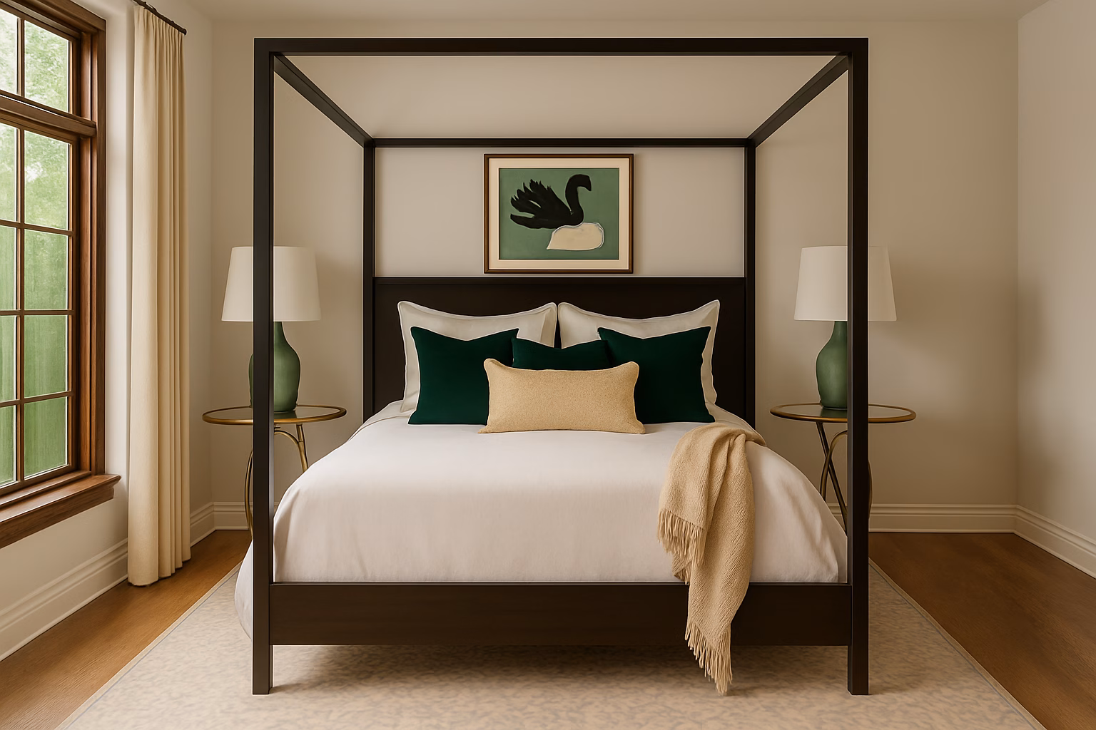 This bedroom balances strong architectural lines with layered comfort. Deep greens and warm gold accents create a retreat that feels restful yet bold, refined yet inviting—a space designed for both presence and peace.